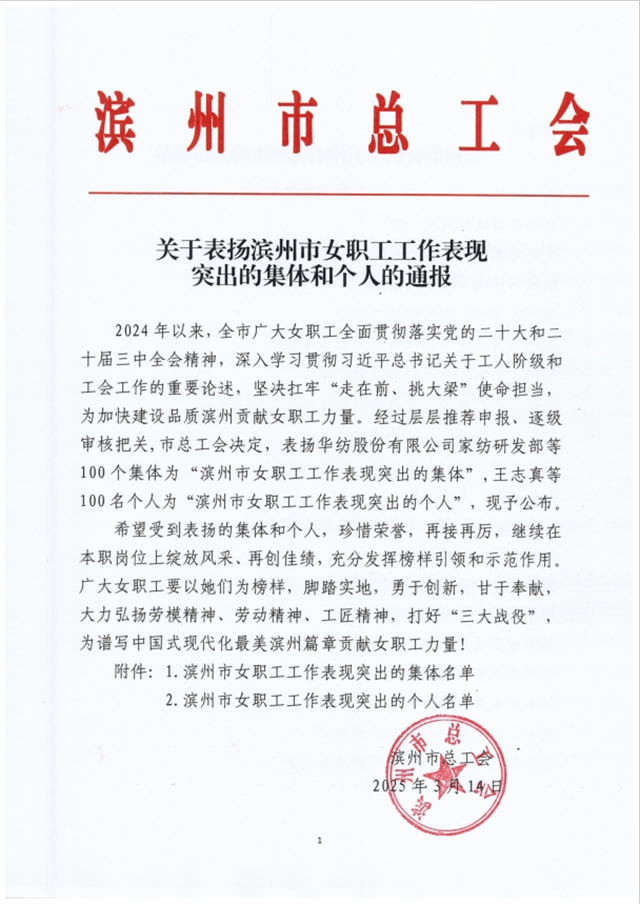 近日,濱州市總工會公布《關于表揚濱州市女職工工作表現(xiàn)突出的集體和個人的通報》文件,家紡研發(fā)部憑借卓越的工作表現(xiàn)和突出貢獻,榮獲“濱州市女職工工作表現(xiàn)突出的集體”榮譽稱號。